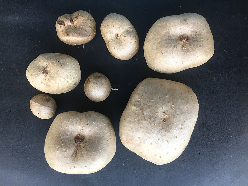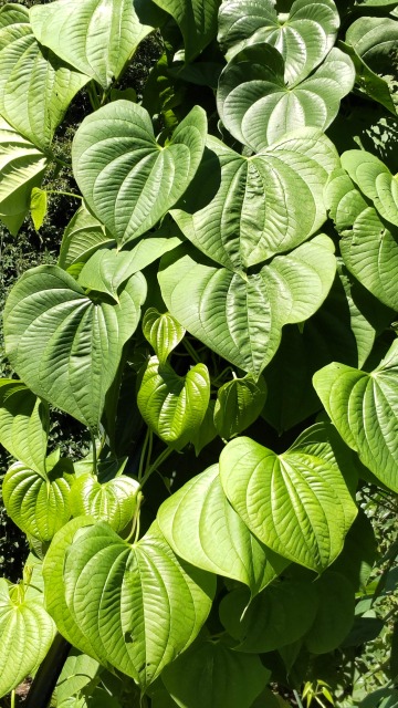 ニガカシュウは、薬用植物の一種である。 画像出典:(上)葉の画像は東京都薬用植物園にて筆者撮影/(下)https://commons.wikimedia.org/wiki/File:Inhame-voador_(Dioscorea_bulbifera).jpg ニガカシュウのいも。 科名:ヤマノイモ科ヤマノイモ属 学名:Dioscorea bulbifera 原産地:インド 生態:蔓性多年草 関東地方南部異性から九州、朝鮮半島、中国、台湾、マレーシアやインドに分布する蔓性多年草で、わが国には江戸時代に渡来している。林縁や山地に生え、葉はハート形で互生し、雌雄異株で、夏から秋にかけて、葉腋に穂状花序を出し、薄紫色の小さな花を咲かせる。塊根、いわゆるイモは大きな扁球形で、表面に毛が生えている。葉腋には直径2㎝ほどの凹凸の多いムカゴを生じる。 和名は、葉の形状がカシュウ(ツルドクダミ)に似ていることと、塊茎やムカゴがかなり強い苦みを持っていることによる。かつては救荒食として食用にされたことがある。加熱すると苦みが消え、ジャガイモに似た風味があるという。 塊茎を「黄薬子」と称し、止血や鎮痛剤、解毒薬に用いる。ただし、ステロイド系の毒素が含まれるという報告があるため、多量に食したり、医師の判断を仰がずに薬用として利用することは控える。