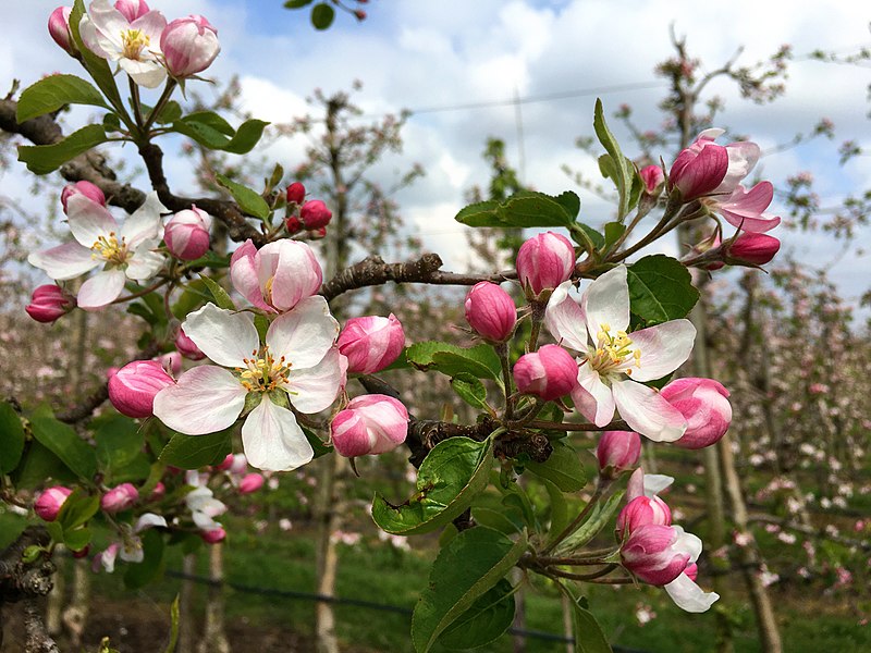 リンゴ(セイヨウリンゴ)は、果樹の一種である。 画像出典:(上)https://commons.wikimedia.org/wiki/File:Apple_plantation_in_Ressen_(Lingewaard).jpg?uselang=ja(中)小石川植物園にて写真撮影.。「ニュートンのリンゴ」という品種である。(下)https://commons.wikimedia.org/wiki/File:Red_apple_with_leaf.jpg?uselang=ja 赤リンゴの果実。 科名:バラ科リンゴ属 学名:Malus domestica 原産地:小アジア・コーカサス地方 生態:落葉小高木 小アジアやコーサカス地方が原産であるとされる落葉高木。わが国には幕末期に導入され、明治時代にあまねく栽培されるようになった。まだワリンゴが主流であった当時はオオリンゴ(大林檎)と呼称された。 我が国の最初の記録は、越前藩主・松平春嶽が自邸に苗木を植え、果実を収穫し、果実をジャムにして餅に塗って食したという記録が残っている。 樹高は8m内外で、春に白色ないしは薄紅色の花を咲かせる。果実は直径約3~15 cm 、重さ約35~1000g。外皮の色は赤や黄緑,または黄色をしている。「ふじ」や「王林」「ゴールデンデリシャス」「アルプス乙女」「トキ」など多くの品種がある。主に果実を生食するほか、ジュースやジャム、菓子に加工する。 果実は熟すと「蜜入り」となり、この状態が最も味が良いとされる。なお、旧約聖書『創世記』に登場するアダムとエバが蛇にそそのかされて食したことで知られる「禁断の果実」は本種ではないかという説が根強かったが、近年はブドウやイチジク、コムギなど諸説ある。 なお、前近代まで栽培されていたワリンゴ(M.pumila)は平安時代に渡来し、当時は花を観賞用とするのみであったが、鎌倉時代から果実をドライフルーツや生食など、食用に供されるようになった。樹高はセイヨウリンゴとほぼ変わらないが、病気に弱いという特性や、果実が小さいなどの特徴もあり、明治以降は栽培がすたれ、戦後には絶滅寸前にまで追い込まれたが、現在はその特性が認められ、東北・甲信越地方で細々と栽培されている。
