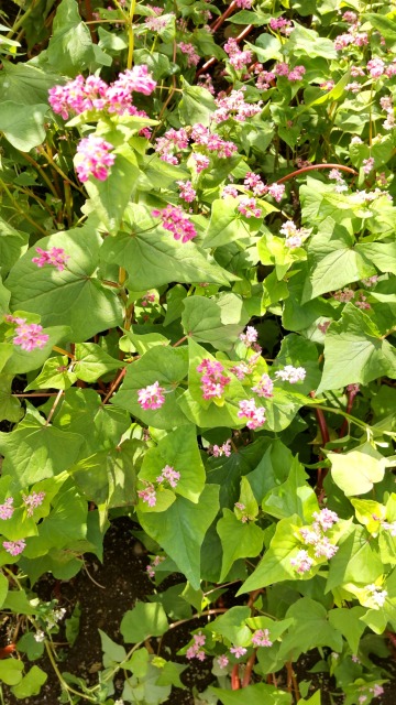 画像出典:東京都薬用植物園にて筆者撮影 シャクチリソバ(赤地利蕎麦)はインド北部が原産で、各地で栽植され、野生化もしている。若い葉を野菜として利用して、根茎を解毒剤として利用する。種子は不味くて食用に適さない。草丈は1mで、茎は赤色を帯びる。発芽から数日後の若い芽が「そばのスプラウト」として出回ることがある。