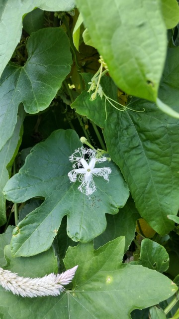画像出典:いずれも東京都薬用植物園にて筆者撮影 科名:ウリ科カラスウリ属 学名:Trichosanthes anguina 原産地:インド 生態:蔓性一年草 別名:ケカラスウリ(毛烏瓜、同名の雑草あり)、ゴードビーン インドが原産のつる性一年草で、わが国には明治期に渡来しているものの、今日に至るまであまり普及していない。草姿は同属のカラスウリに似る。7月から9月にかけて花を咲かせ、その花もカラスウリとよく似ており、5枚の花弁の先端が分岐して糸状となる。果実は1m内外の長さとなり、白地に濃い緑色の縦じまが入る。また、深緑色地に細く白い縦じまが走るものもある。果実の表面には初めは細かい毛があるので、毛烏瓜(ケカラスウリ)の名称で呼ばれる。熟すと黄色ないしは鮮紅色になり、紙のように薄く、破れやすくなる。 原産地のインドや東南アジア諸国では、若い果実をカレーなどに入れて食用としている。また、きゅうりに似た味で、サラダにすることもできる。わが国では「セイロン瓜」の名称でごくまれに市場に流通するが、たいていは自家消費である。果樹園の近くに植えて木につるを絡ませるように栽培することで、木に蛇が止まっているかのように錯覚させ、果物の食害を防ぐ効果が注目されている。花も涼しげなので、グリーンカーテンの効果も期待できる。 英語圏では果実の見た目から「スネークゴード」の名称で知られるが、ウリ科植物で、若い果実の見た目がインゲン豆のさや(・・)に似ていることから、「ゴードビーン」の名称で呼ばれることもある。