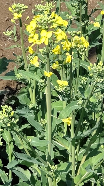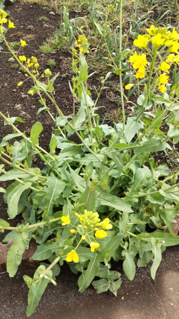 中国から渡来し、わが国では種子から油をとるために栽培される一年草である。在来種を二ホンアブラナ、江戸末期~明治期以降に中国に導入された品種をウンタイアブラナvar.nippoleifaと呼んで区別することがある。葉はなめらか。草丈は0.5~1m。 春に花を咲かせ、花弁は長さ1㎝ほどである。花ののちに細長い莢状の果実をつけ、熟すと裂けて黒褐色の種子をばらまく。この種子からとった油が菜種油、いわゆるキャノーラ油と呼ばれるもので、かつては灯火用に用いられ、現在は料理用油や機械油として用いられる。ただし、現在採油用として栽培されるものはセイヨウアブラナ(B. napus)の利用がほとんどを占めている。また、間引いた若い苗や花のつぼみも野菜として食用にすることができる。 セイヨウアブラナもまた同様に若苗やつぼみが食用になり、江戸時代から現在の埼玉県から東京都に該当する地域にて栽培されてきた「のらぼう菜」が代表的品種である。 画像出典:セイヨウアブラナ。東京都薬用植物園にて筆者撮影 セイヨウアブラナの一品種「のらぼう菜」。東京都薬用植物園にて撮影。 花は花材に用いられることもあり、葉が縮緬状になる品種が「寒咲きナタネ」の名称で流通する。冒頭の2枚目に掲載した写真がそれである。