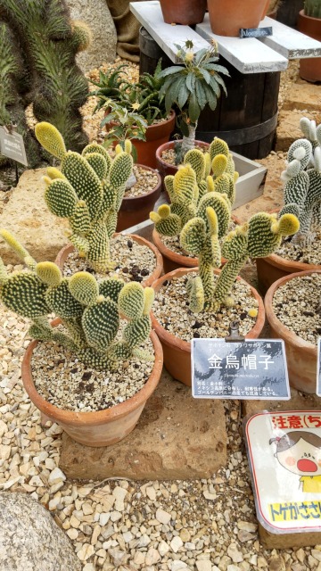 画像出典:上下いずれも福岡市植物園にて筆者撮影。(上)金烏帽子。(下)白桃扇(はくとうせん)。 学名:Opuntia microdasys ウチワサボテンの代表的品種。棘は短く、黄色である。全長は10mほどであるが、鉢植えの園芸植物として流通する場合は10cm内外である。変種の白桃扇は、棘が白色。両者とも見た目がかわいらしく栽培も容易なのでサボテン類の中でもよく流通するが、不用意にトゲの部分に触ると、トゲが取れて刺さり、トゲの刺さった部分の皮膚がしこりのようになることがある。