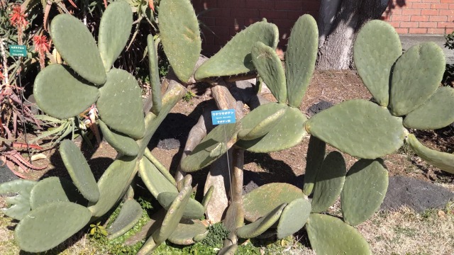 ウチワサボテンは、園芸植物の一種である。 画像出典:夢の島熱帯植物館にて筆者撮影 科名:サボテン科ウチワサボテン属 学名:Opuntia ficus-indica 原産地:メキシコ 生態:多年草 メキシコが原産の多年草で、わが国には江戸時代に渡来し、現在は温室や露地で栽培され、観葉植物の中でも人気の高い品種となっている。茎は高さ2m内外で、多数分岐し、茎の節は最大で30㎝ほどになる。表面に1本から2本の棘があり、基部に接した長い毛がある。葉は小さな針状で、この棘は葉が変化したもので、過度な水分蒸発を防ぐための工夫なのである。 夏に黄色の花を咲かせ、直径は7㎝~10㎝である。果実は洋ナシ型で光沢があり、緑色から赤紫色に熟し、「カクタスペア」あるいは現地名の「トゥーナ(tuná)」の名称で呼ばれ、果物として食用にする。甘酸っぱい風味があるという。また、棘が少ないかあるいはほとんどない品種は茎の表面を軽く削ぎ、棘をとってから焼いて食す。茎には咳止めや解熱の効果があるとされ、トゲをそいでからすりおろしたものを1回につき10gほど服用する。最近は、糖尿病などの生活習慣病にも効果があるとされる。 和名のサボテンは、古くは油汚れを用いるために茎を用いていたが、その際に茎から出た汁がシャボン、いわゆる石鹸のようであったため、シャボンテイ→サンホテイ→サボテンと転訛した。