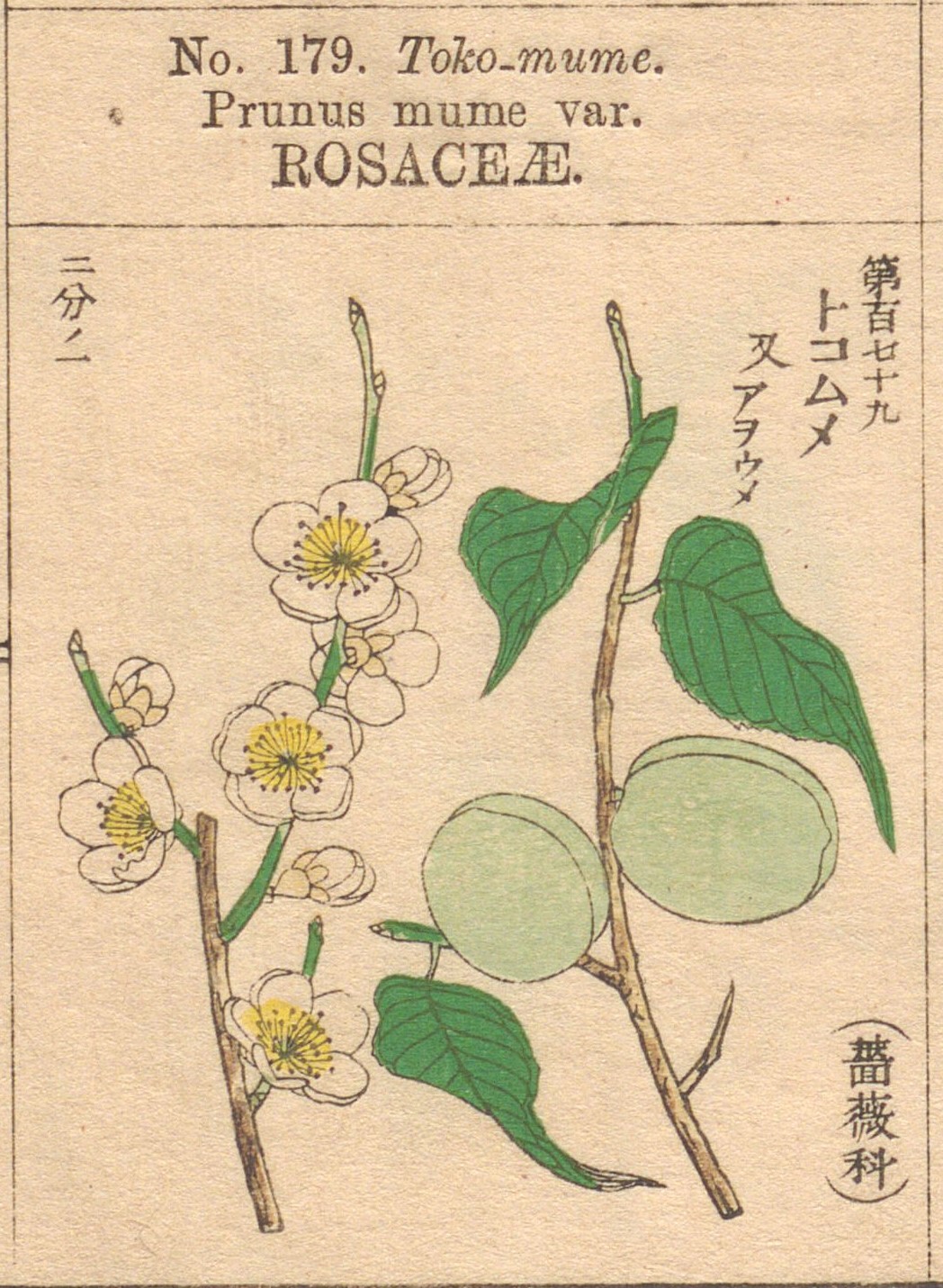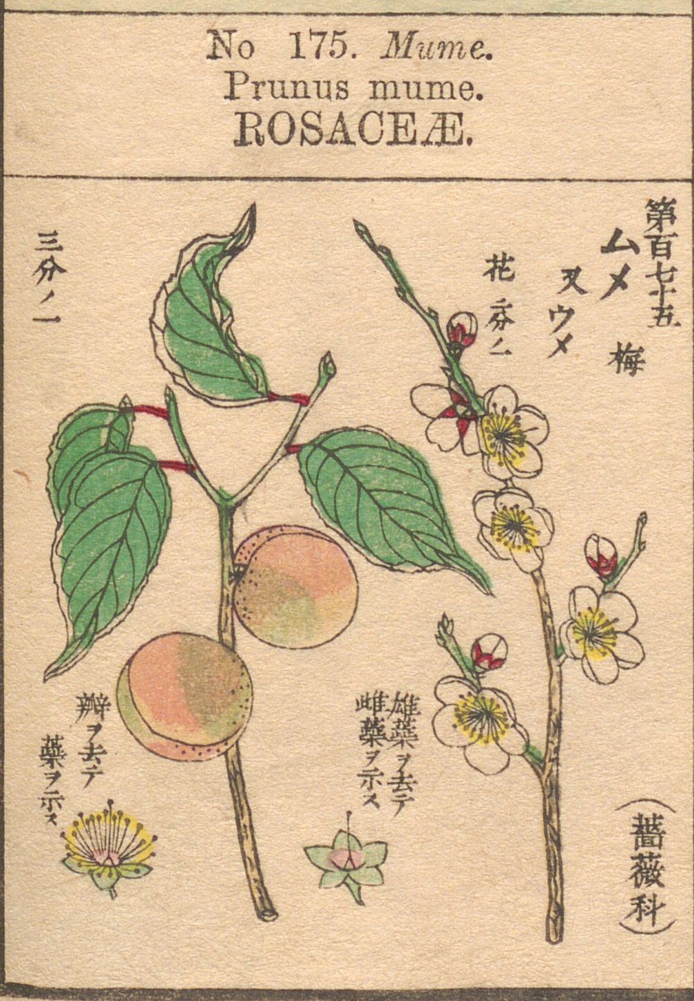 ウメ(梅)は、果樹ならびに花を観賞用にする樹木の一種である。 画像出典:https://iiif.dl.itc.u-tokyo.ac.jp/repo/s/agriculture/document/5bfde8bf-0b54-7848-97d6-1ee30cf9a645#?c=0&m=0&s=0&cv=25&xywh=-810%2C-1%2C6863%2C4094 「有用植物図説」より抜粋 科名:バラ科サクラ属 学名:Prunus mume 原産地:中国 生態:落葉高木 中国が原産の落葉高木で、わが国には弥生時代に入ってきたと思われ、当時の遺跡から種子が出土している例が散見される。今日では庭木としてわが国の各地で栽培されているが、九州の大分県や宮崎県の一部には、野生化した個体がみられるという。 樹高は6mに達し、多く枝分かれし、若い枝には毛がかすかにあるかあるいはほぼない。葉は互生し、葉の大きさは5㎝~8㎝で、卵型で周囲に細かな鋸歯がみられる。1月から3月にかけて、葉の出現に先立って前年枝の葉腋に芳香のある5枚の花弁からなる花を咲かせる。花は白色や鮮やかな赤味の強いピンク色があり、品種は「豊後」(後述)や「白加賀」「南高」「紅サシ」など様々で、300種を優に超える。果実は球形で、縦に1筋の溝があり、当初は緑色だが、梅雨ごろに黄色く熟し、木から落ちて芳香を放つ。青梅はアミグダリンという生産配糖体を含んでいるので、生食すると腹痛や嘔吐などの症状を引き起こす。それゆえ、シソや塩につけこんで梅干にするほか、酒に漬けて梅酒にする。果実を黒くなるまでいぶしたものは「烏梅(うばい)」という名称で漢方薬として知られ、健胃、整腸、消炎、細菌性腸炎、腸内異常発酵、駆虫、止血、強心作用がある。