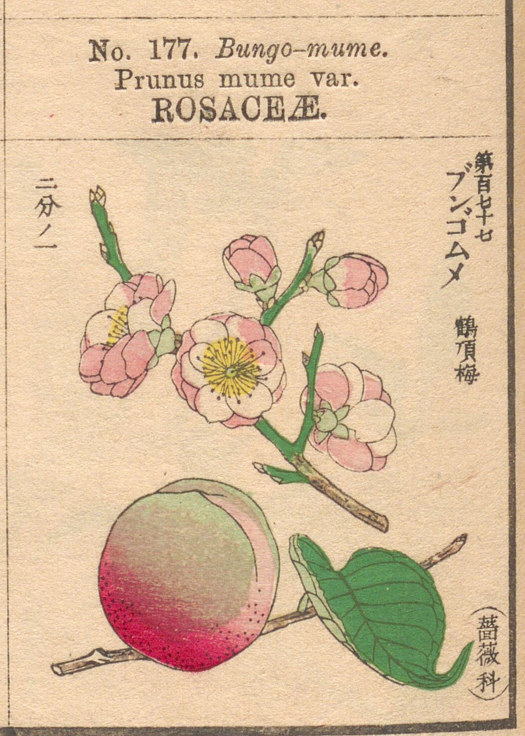 画像出典:https://iiif.dl.itc.u-tokyo.ac.jp/repo/s/agriculture/document/5bfde8bf-0b54-7848-97d6-1ee30cf9a645#?c=0&m=0&s=0&cv=25&xywh=-810%2C-1%2C6863%2C4094 「有用植物図説」より抜粋 名前の通り、豊後(大分県)で古くから栽培されてきた品種である。母種のウメより葉や果実が大きい品種である。花はふつう八重咲で、薄いピンク色である。果実の直径は5㎝で、熟すと濃い橙色になる。本種はアンズとの交配品種であるとされる。果実の利用法はウメに同じで、花も観賞用にされる。