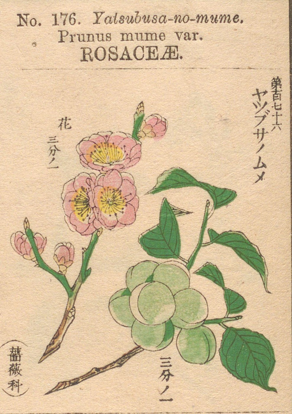 画像出典:https://iiif.dl.itc.u-tokyo.ac.jp/repo/s/agriculture/document/5bfde8bf-0b54-7848-97d6-1ee30cf9a645#?c=0&m=0&s=0&cv=25&xywh=-810%2C-1%2C6863%2C4094 「有用植物図説」より抜粋 明治時代の植物図鑑に収録されている品種で、「果実が熟さず、冬まで枝に緑色の果実が実ったままであるので、常梅の名称がある」(筆者現代語訳)と原著にある。どうやら、古くは冬まで緑色のまま干からびた果実を食用にしていたらしい。現在は、果実が落ちないことを「受験に『落ちない』」にかけたゲン担ぎとして、現在は道明寺天満宮など、各地の神社に植えられている。