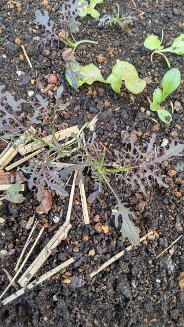 画像出典:大学の庭園にて筆者撮影 葉が深く切れ込む品種で、分けつが旺盛な品種。葉色が鮮やかな緑色をしているものと、写真のように紫色になるものがある。漬け物やおひたし、サラダ等に向く。草丈10㎝内外の若い苗をベビーリーフとして利用することも。