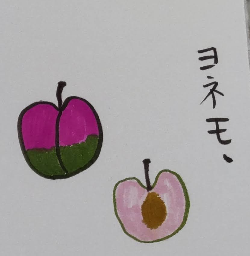 画像出典:筆者による描画 鹿児島県で栽培されてきた品種で、明治時代の植物図鑑「有用植物図説」には「スモモの一品種で、果肉が赤紫色のものである」という解説がつけられたうえで「ウラベニスモモ」の名称で紹介され、「ヨネモモ」はその別名として記されている。現在は皇居東御苑の果樹古品種園で現物を見ることができる。味は甘みが弱く、酸味が強いので、次第に流通に乗らなくなったようである。鹿児島県で栽培されていた「万左衛門」という品種も同様の風味を持っているという。こちらも皇居東御苑の果樹古品種園で現物を見ることができる。