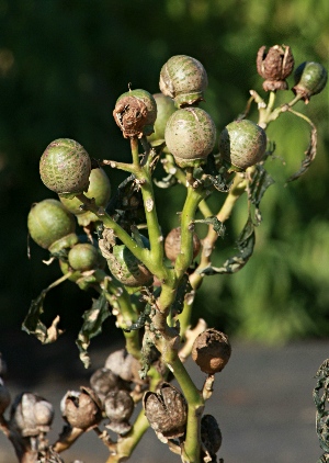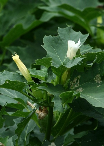 画像出典:東京都薬用植物園にて筆者撮影 熱帯アメリカが原産の一年草で、わが国には明治期に渡来し、今は全国に野生化しているほか、薬草園で栽培されることがある。花は白色でじょうご型だが、上から見ると五角形で、中心部が薄紫色になるため、古くは「フジイロマンダラゲ」(藤色曼陀羅華)の名称でも飛ばれた。果実は卵型で、棘は短く、まばらながらも鋭い。種子は黒色で、形状も黒ゴマによく似ているため、中毒事故が起きやすい。写真の品種は、紫色の射さない白花の品種である。