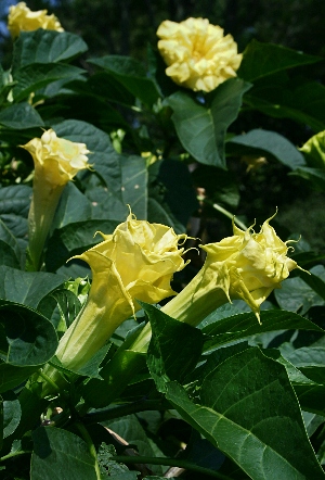 画像出典:https://www.ootk.net/cgi/shikihtml/shiki_1753.htm 『四季の山野草』より引用 チョウセンアサガオの園芸品種で、花が八重咲きになるものである。漏斗状の花が二段重ねになる品種で、花の色は写真のように白地に紫色の模様が入るものや、白みを帯びた黄色がある。 果実は球形で、時には複数の果実が融合し、でこぼことした独特の形状になることがあるが、いずれの場合も短い突起を持つ。