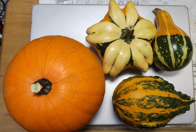 オモチャカボチャ(玩具南瓜)とは、園芸植物の一種である。 画像出典:花の写真撮影は青木繁伸(群馬県前橋市)。果実の写真はいずれも自宅にて筆者撮影 科名:ウリ科カボチャ属 学名:Cucurbita pepo var.ovifera 原産地:北米南部 生態:つる性一年草 別名:コナタウリ、カザリトウナス、カザリウリ ペポカボチャの変種で、北米南部が原産の蔓性一年草である。わが国には明治時代に渡来し、現在は園芸植物として庭に栽培されるほか、お盆のお供えやハロウィン・クリスマス向けのフラワーアレンジメントの素材として用いる。 春に種子をまき、蔓をオベリスクや支柱に這わせるほか、食用種のカボチャと同様に地面に這わせることもある。食用種の場合、果実の味をよくするために「摘心」を行うことがあるが、本種は摘心せず放任でも果実がよく実る。 草姿や花、種子の形状などは食用種のカボチャとよく似ているが、葉や花弁の先端がとがり、かつ蔓の棘が鋭いのが特徴である。また、果梗はニホンカボチャのそれと同じく熟せば木質化するが、ニホンカボチャの果梗が熟すと褐色になり、果実と接する部分が広がって「座」を作るのに対し、本種の果梗の果実と接する部分はあまり広がらず、果梗の色も褐色ないしは深緑色である。深緑色のものは一見すると熟しているとはわからないが、触ってみて木のように硬くなっていれば熟しているとわかる。 果実の形状は様々で、オーソドックスなカボチャ型をしたものやひょうたん型、星形や丸型、卵型、キノコ型など多彩で、表面は平滑であるか、程度の差はあれどごつごつとしたこぶ状突起を有するものもある。果実の色合いも橙色や黄色、深緑色や黄緑色、白色など多彩で、単色のものもあれば果実上部が黄色で下部が緑色のツートンカラーのもの、スイカのように縞模様が入るものもある。 果肉は繊維質でぱさぱさしており、青臭く味もよくないため食用にはしない。食用の品種で見た目が面白いものが「オモチャカボチャ」として出回ることがあるが、その名義で売られているものは、花卉農家が花卉用の農薬を用いて栽培したものである。食用の農産物と花卉とでは農薬の基準値が異なるので、試食しない方が賢明である。果皮が食用種に比べて非常に硬いので(このため、古くは「コナタウリ」の名称でも呼ばれた)、冬まで保存することができ、条件がそろえば年を越すこともあるが、低温に遭うと腐り始める。よく熟したものであれば、数日に1回、果実表面を乾いた布で磨くとヒョウタンのように果皮が硬くなり、「ドライフラワー」状態となる。果皮が硬くなったものは時間がたつと果皮色が褪せてくる。また、表面にはカビが点状に生えることがあるが、そうした場合はドライヤーなどでしっかり乾燥させ、更にたわしかやすりで磨くとカビの蔓延を防ぐことができる。