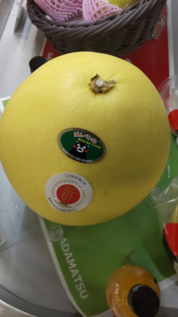 画像出典:筆者撮影(京王百貨店新宿店) ザボンの中でも果実が最大の品種で、直径は20㎝で、果実の重さは2㎏内外である。わが国には大正時代末期に植物学者・島田弥市がベトナムのサイゴン市から持ち込んだのが始まりだが、栽培方法が確立されたのは1930年代である。現在は熊本県八代市のブランド品となっている。利用方法はザボンに同じ。