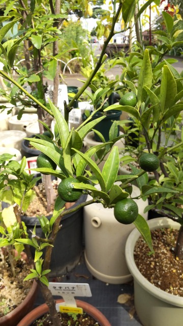 画像出典:東京都薬用植物園にて筆者撮影 科名:ミカン科ミカン属 学名:Citrus tachibana 原産地:北海道を除く日本全土 生態:常緑小高木 別名:ニッポンタチバナ わが国固有の柑橘類で、樹高は2m~4mになり、枝は緑色で密生し、棘がある。葉は卵型で分厚く、黒みを帯びた緑色である。夏に星形の白い花をつけ、秋から冬にかけて直径3㎝の果実をつけ、緑色から黄色味の強いオレンジ色に熟す。表面はなめらかである。熟しても酸味が強く、また果実が小さく種子の多いことから生食にはされず、果汁を料理の風味づけ、いわば香酸柑橘として利用することもできるが、もっぱらは生け花などの観賞用である。 近縁種のコウライタチバナ(C.nipponkoreana)は樹形はタチバナに似るが、全体的に大振りで、果実の形状はユズのようにやや凹凸があるのが特徴である。山口県や朝鮮半島に自生しており、山口県に自生しているものは絶滅危惧IA類・県の天然記念物に指定されている。現在園芸店で「タチバナ」として栽培されているのはコウライタチバナであることの方が多いが、あまりわが国の在来種と区別されていないのが現状である。 我が国の最古の記録は、田道間守(たじまもり)が垂仁天皇から常世の国に赴き、「非時香菓(ときじくのかぐのこのみ)」なる妙薬を持ち帰るよう命ぜられ、その「非時香菓(ときじくのかぐのこのみ)」が「是今橘也(これいまのたちばななり)」と解説している記述である*1。その故事にちなみ、京都御所紫宸殿の庭には「右近橘」と「左近桜」が栽植されている。戦国時代には、井伊氏や黒田氏が本種の果実を図案化した家紋を使用していた。 牧野富太郎は明治25年、本種の自生品を高知県佐川町川の内の石灰岩地にて発見し、「ニッポンタチバナ」と命名して本種の詳細を精密な図とともに「植物研究雑誌」に記載した。 現在では、遺伝子を解析したところ、ヒュウガナツやシークワーサーなどの先祖にあたる種であることが明らかになっている。